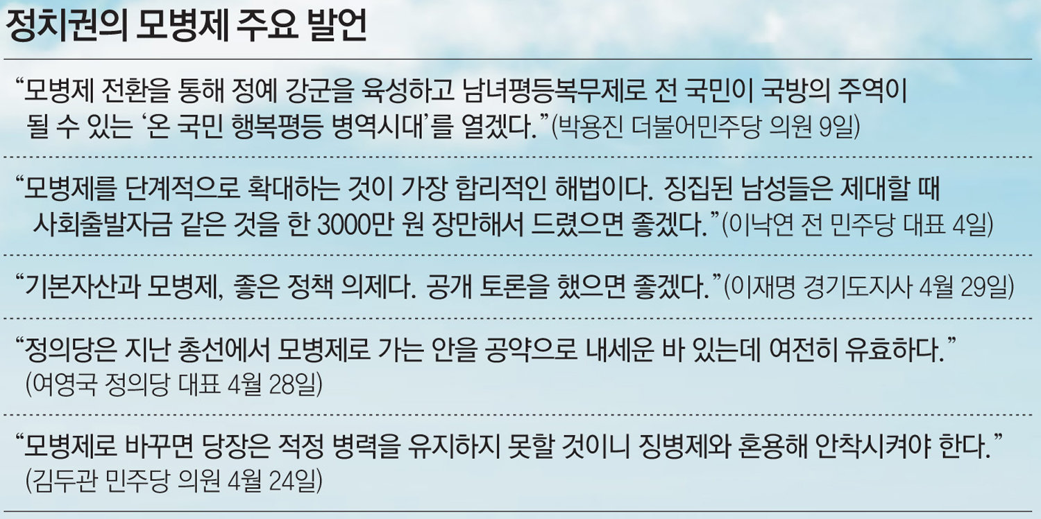 《내년 3월 대선을 앞두고 모병제 도입 논란이 벌써부터 뜨거워지고 있다. 4·7 재·보궐 선거에서 ‘이남자(20대 남성)’의 표심 얻기에 실패했던 여당의 잠룡들이 모병제 도입 가능성을 내비치기 시작했기 때문이다. 정부도 거들고 나섰다. 김부겸 국무총리 후보자는 7일 모병제에 대해 “대선 국면에서 논의될 텐데 정확한 실정을 여야 모두 알고 대안을 고민하고 토론할 수 있도록 하겠다”고 말했다. 인구 감소로 인해 현재의 징병제로는 병력 수급에 한계가 있는 만큼 모병제 도입을 서둘러야 한다는 의견이 있다. 그러나 북한의 핵위협이 커진 상황에서 병력 감축 가능성이 큰 모병제의 도입은 시기상조란 반론도 만만치 않다.》