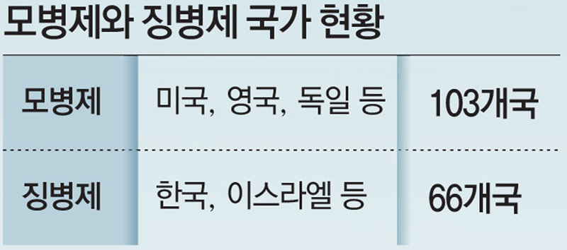 현재 모병제를 실시하는 나라는 미국 영국 독일 일본 등 103개국으로 유엔 회원국(192개국)의 57.4%에 이른다. 반면 징병제를 유지하는 국가는 스위스 터키 이스라엘 등 66개국이다.