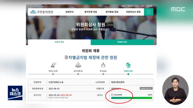 차별금지법을 제정해달라는 국회 국민동의청원이, 소관 상임위 회부 기준인 동의자 10만명을 넘겼습니다.