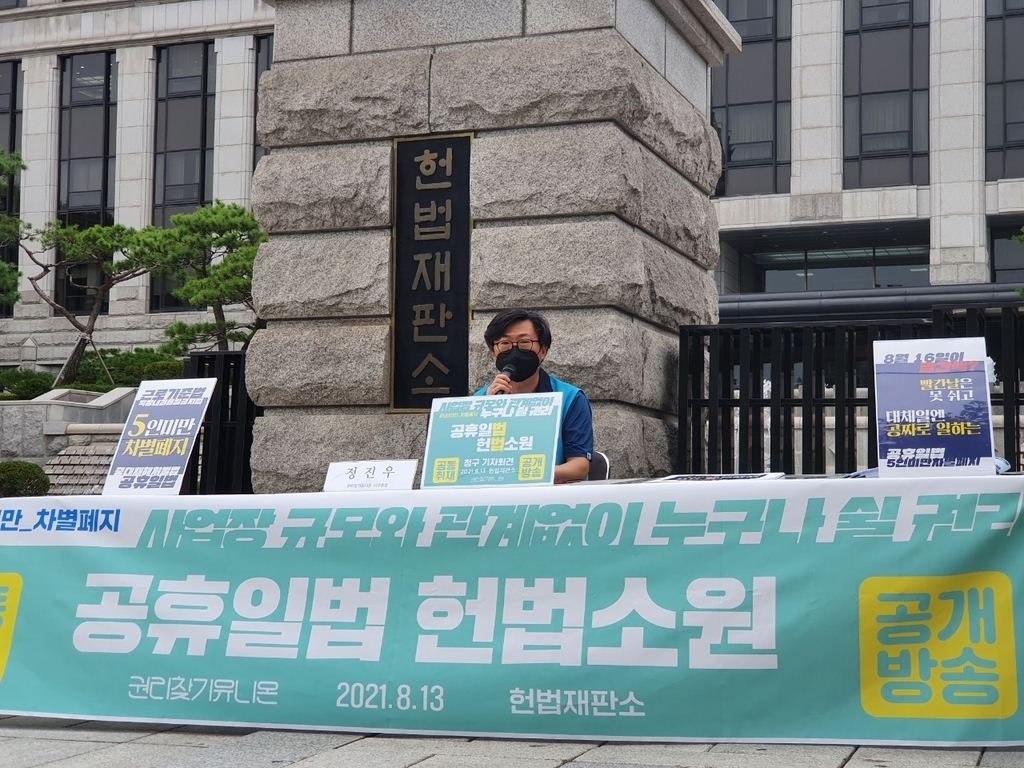시민단체 권리찾기유니온은 13일 서울 종로구 헌법재판소 앞에서 기자회견을 열고 "공휴일에 관한 법률(공휴일법) 제4조에 의해 5인 미만 사업장은 대체공휴일 적용을 받지 못하는 것은 위헌"이라며 헌법소원심판을 청구했다.