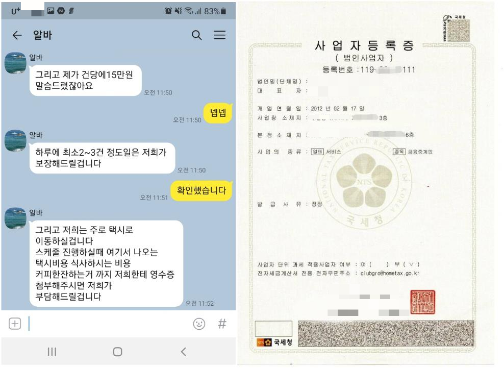 잠결에 이씨는 "일단 알겠다"며 전화를 끊었다. 수상했다. 이씨는 "20대 초반에 아무 경력 없는 알바생을 어떻게 믿고 회삿돈을 전달을 맡기는지 모르겠다"고 말했다. A 회사는 이런 의심을 예상한듯 했다. 다음날 이들은 메신저로 사업자등록증 사진을 보여줬다. 사업자등록증에서 A 회사는 정말 대표자 이름, 사업장 소재지가 다 적혀있었고 사업 종목도 '금융중개업'이라 돼 있었다. 사업자등록번호는 일부가 가려져 조회가 불가능했다.