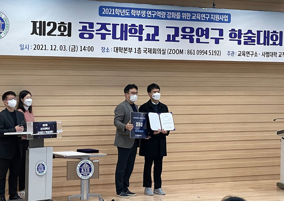 예비교사인 두 학생은 ‘정치와 법 선거 관련 문항의 출제 방향 탐색: 2022 개정 교육과정 도입을 앞두고’라는 논문으로 ‘정치와 법’ 교과목의 평가 문항이 학교 선거교육에 미치는 영향을 분석했다. 또 선거에 대한 학생들의 흥미를 제고하면서 유권자로서 자질을 함양하기 위해 평가 문항의 내용 요소를 다양화하고 지식과 기능을 함께 평가할 수 있는 ‘종합 측정 문항’을 출제하도록 노력해야 한다고 주장했다. 두 사람은 ‘2021년도 공주대학교 교육연구 학술대회’에서도 우수 논문상을 수상했다.